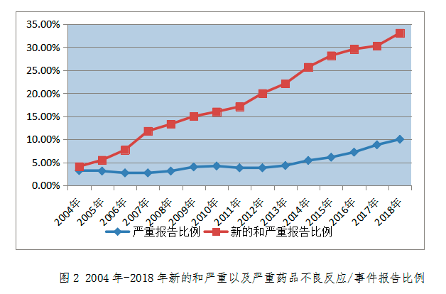 2018年全國藥品不良反應監測網絡收到新的和嚴重藥品不良反應/事件報告49.5萬份;新的和嚴重藥品不良反應/事件報告占同期報告總數的33.1%。新的和嚴重藥品不良反應/事件報告比例持續增加,顯示我國藥品不良反應報告可利用性持續增加。