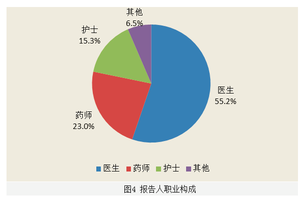 按照報告人職業統計,醫生占55.2%,藥師占23.0%,護士占15.3%,其他職業占6.5%(圖4)。