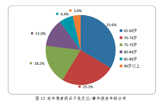 2018年老年患者藥品不良反應/事件報告中,男女患者比為0.96:1。老年患者年齡分布情況, 65-69歲老年患者報告占33.6%,70-74歲老年患者報告占25.1%(圖13)。
